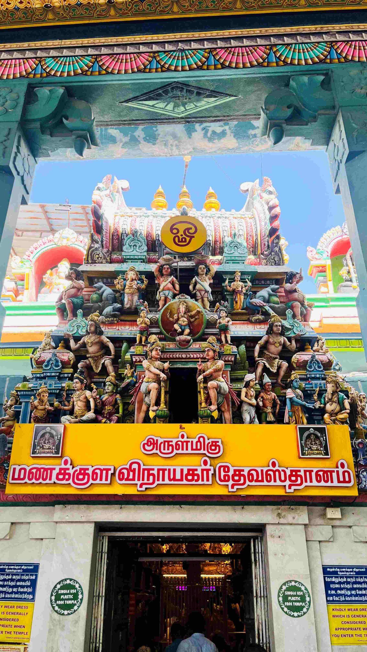 - Temple History Sri Manakula Vinayagar Temple was in existence before the French came and settled in Pondicherry i.e. before 1666. According to Sasthra, Lord GANESHA is named in 16 types based on his various forms out which this god facing the east cost near Bay of Bengal it has been named as Bhuvaneshar Ganapathy, now called as Manakula Vinayagar. In Tamil 'Manal' means sand and 'Kulam' means pond near the sea, earlierly which was full of sand around pond. So the people called the god as Manal Kulathu Vinayagar [means God near the pond of sand]. Later it is named as MANAKULA VINAYAGAR The Manakula Vinayagar Temple is one of the famous ancient temple is in Puducherry, a Union Territory situated in the southern part of Indian sub-continent. The temple is 400 meters West of Bay of Bengal Sea, 165 Km South of Chennai (Capital of Tamil Nadu State), 23 Km of North of Cuddalore and 35 Km East of Villupuram, TamilNadu. The main deity ?Manakula Vinayagar?(Pranavamurthy) of this temple is facing east and the temple is bordered on east by Orlean Street (Now Manakula Vinayagar Koil Street, south by Jawaharlal Nehru Street, north by Law-de-Louristhon street and west by a canal running north-south. This temple is called as Manakula Vinyagar, as that time there was pond (Kulam in tamil) on the western side of this temple and due to proximity of Sea, pond was full of sand (Manal in tamil) Presently the temple is built in 7913 sq. ft. with outer mandapam, Raja gopuram, Kodikambam (18ft tall gold plated), front mandap, Mahamandap, Sanctum, walk around area, other deity prahara, kitchen, office, Urcharvar deity, Marriage Hall, Inside the temple, the presiding deity placed in Karuvarai area 4 X 4 square place as the sanctum and the Vimanam above covered fully with gold plated. The presiding deity Moolavar in Sanctum blesses his devotees with four hands, the top two holding Angusam, Pasam and the right lowe hand with abayadana muthra and the left one varadhana muthra. In the front Mandap vithanam and inside historical scene?ve been painted taking the services of renowned painters. Some of them are Birth of Lord Vinayagar, killing of Kayamuga Sura, Vinayagar marrying Suddhi and Buddhi, Vinayagar blessing Nambiyandar Nambi, etc. பிரெஞ்சுக்காரர்கள் பாண்டிச்சேரியில் வந்து குடியேறுவதற்கு முன்பு, அதாவது 1666 க்கு முன்பு ஸ்ரீ மணக்குள விநாயகர் கோயில் இருந்தது. சாஸ்திரத்தின்படி, விநாயகர் பல்வேறு வடிவங்களின் அடிப்படையில் 16 வகைகளில் பெயரிடப்பட்டுள்ளார், இந்தக் கடவுள் கிழக்கு நோக்கி வங்காள விரிகுடாவிற்கு அருகில் இருப்பதால், புவனேஸ்வர் கணபதி என்று பெயரிடப்பட்டுள்ளது, இப்போது மணக்குள விநாயகர் என்று அழைக்கப்படுகிறது. தமிழில் 'மணல்' என்றால் மணல் என்றும், 'குளம்' என்றால் கடலுக்கு அருகில் உள்ள குளம் என்றும், முன்பு குளத்தைச் சுற்றி மணல் நிறைந்திருந்தது என்றும் பொருள். எனவே மக்கள் கடவுளை மணல் குலத்து விநாயகர் [மணல் குளத்திற்கு அருகில் உள்ள கடவுள்] என்றும் அழைத்தனர். பின்னர் இது மணக்குள விநாயகர் என்று பெயரிடப்பட்டது. மணக்குள விநாயகர் கோயில், இந்திய துணைக் கண்டத்தின் தெற்குப் பகுதியில் அமைந்துள்ள ஒரு யூனியன் பிரதேசமான புதுச்சேரியில் உள்ள புகழ்பெற்ற பழங்கால கோயில்களில் ஒன்றாகும். இந்தக் கோயில் வங்காள விரிகுடா கடலுக்கு மேற்கே 400 மீட்டர் தொலைவிலும், தமிழ்நாட்டின் தலைநகரான சென்னைக்கு தெற்கே 165 கி.மீ தொலைவிலும், கடலூரிலிருந்து வடக்கே 23 கி.மீ தொலைவிலும், தமிழ்நாட்டின் விழுப்புரத்திலிருந்து கிழக்கே 35 கி.மீ தொலைவிலும் அமைந்துள்ளது. இந்தக் கோயிலின் பிரதான தெய்வமான "மணக்குள விநாயகர்" (பிரணவமூர்த்தி) கிழக்கு நோக்கி உள்ளது. கிழக்கே ஆர்லியன் தெரு (தற்போது மணக்குள விநாயகர் கோயில் தெரு), தெற்கே ஜவஹர்லால் நேரு தெரு, வடக்கே லா-டி-லூரிஸ்தான் தெரு மற்றும் மேற்கே வடக்கு-தெற்கே ஓடும் கால்வாய் ஆகியவை கோயிலின் எல்லையாக உள்ளன. இந்த