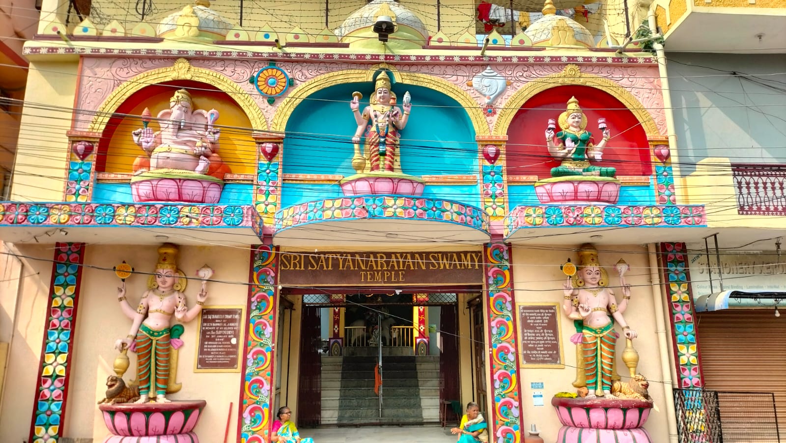 - Temple History The temple is located about 3.7 km from Secunderabad Railway Station. Upon entering, devotees first have the darshan of Lord Sri Krishna. Moving further inside, one reaches the main temple, where the presiding deity is Sri Satyanarayana Swamy. Alongside the main deity, the temple also houses several other deities, including Lord Ganapathi, Goddess Santoshi Mata, Goddess Durga Mata, Lord Ram Darbar, Lord Hanuman, Shirdi Saibaba, Lord Venkateswara Swamy, Lord Shiva, and the Nava Grahalu. ఈ ఆలయం సికింద్రాబాద్ రైల్వే స్టేషన్ నుండి దాదాపు 3.7 కి.మీ దూరంలో ఉంది. లోపలికి ప్రవేశించిన తర్వాత, భక్తులు ముందుగా శ్రీ కృష్ణుడి దర్శనం పొందుతారు. మరింత లోపలికి వెళితే, ప్రధాన ఆలయానికి చేరుకుంటారు, అక్కడ ప్రధాన దేవత శ్రీ సత్యనారాయణ స్వామి. ప్రధాన దేవతతో పాటు, ఈ ఆలయంలో గణపతి, సంతోషి మాత, దుర్గా మాత, రామ దర్బార్, హనుమంతుడు, షిర్డీ సాయిబాబా, వెంకటేశ్వర స్వామి, శివుడు మరియు నవ గ్రహాలు వంటి అనేక ఇతర దేవతలు కూడా ఉన్నారు.