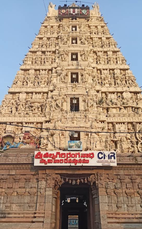 - Temple History Sri Ranganathaswamy Temple, also known as Talpagiri Ranganathaswamy Temple or Ranganayakulu, is a prominent Hindu temple in Nellore, Andhra Pradesh, dedicated to Lord Ranganatha—Lord Vishnu in a reclining posture on the serpent Adisesha. Situated on the banks of the Penna River, this ancient temple is believed to have origins dating back to the Pallava period in the 7th century and was further expanded during the 12th century by King Raja Mahendra Varma. It is regarded as one of the oldest and most revered temples in Nellore. A striking feature of the temple is its towering seven-storied gateway, the Gaaligopuram, meaning “wind tower.” The gopuram rises to a height of nearly 70 feet and is crowned with ten-feet-tall gold-plated kalashams. The tower was constructed by Yeragudipati Venkatachalam Panthulu and showcases the architectural grandeur of the temple. Sculptures of Brahma, Vishnu, Shiva, various saints, and intricate carvings adorn the tower and inner sanctum, reflecting the artistic brilliance of the time. Inside the sanctum, the reclining idol of Lord Ranganatha rests magnificently on Adisesha. Devotees circumambulate the inner prakaram while chanting the Sri Vishnu Sahasranamavali, whose thousand names are inscribed on the walls of the shrine. The temple complex also features a mirror hall that draws devotees, and includes shrines for Goddess Rajyalakshmi towards the south and Goddess Andal towards the north of the main temple. According to legend, Lord Vishnu descended to Earth along with Goddess Sridevi and directed Adisesha to become His resting place. Obeying the divine command, Adisesha took the form of a hill at this location, earning the name Talpagiri Kshetra—“the hill of the serpent bed.” It is believed that Sage Kashyapa performed a Poundarika Yaga here on Ekadashi to propitiate the Lord, who appeared from the sacrificial fire to bless the sage. The Skanda Purana narrates that Sri Ranganatha emerged from this sacred fire pit. Throughout the centuries, kings, monks, and devotees rendered service to the temple. When Udayagiri came under foreign attack, members of the Balija community risked their lives to bring the processional deities to Nellore for safekeeping. The great Telugu poet Tikkana Somayaji, minister to King Manumasiddhi, translated the Mahabharata into Telugu at this sacred spot. For over 1300 years, regular worship has continued here following the Sri Vaishnava Pancharatra Agama tradition, along with major festivals such as Brahmotsavam, Pavithrotsavam, and Vasanthotsavam. Devotees believe that worshipping here grants divine blessings and leads the soul towards liberation. తల్పగిరి రంగనాథస్వామి ఆలయం లేదా రంగనాయకులు అని కూడా పిలువబడే శ్రీ రంగనాథస్వామి ఆలయం, ఆంధ్రప్రదేశ్లోని నెల్లూరులో ఉన్న ఒక ప్రముఖ హిందూ దేవాలయం. ఈ ఆలయం ఆదిశేషునిపై శయనించిన భంగిమలో ఉన్న విష్ణుమూర్తి అయిన శ్రీ రంగనాథునికి అంకితం చేయబడింది. పెన్నా నది ఒడ్డున ఉన్న ఈ పురాతన ఆలయం 7వ శతాబ్దంలో పల్లవుల కాలం నాటిదని నమ్ముతారు మరియు 12వ శతాబ్దంలో రాజా మహేంద్ర వర్మచే మరింత విస్తరించబడింది. ఇది నెల్లూరులోని అత్యంత పురాతన మరియు అత్యంత గౌరవనీయమైన దేవాలయాలలో ఒకటిగా పరిగణించబడుతుంది. ఈ ఆలయం యొక్క ఒక ముఖ్యమైన ఆకర్షణ దాని ఏడు అంతస్తుల ఎత్తైన ముఖద్వారం, గాలిగోపురం. ఈ గోపురం దాదాపు 70 అడుగుల ఎత్తుకు పెరుగుతుంది మరియు దాని శిఖరంపై పది అడుగుల ఎత్తైన బంగారు పూత పూసిన కలశాలు ఉన్నాయి. ఈ గోపురాన్ని యెరగూడిపాటి వెంకటాచలం పంతులు నిర్మించారు మరియు ఇది ఆలయ వాస్తుశిల్ప వైభవాన్ని ప్రదర్శిస్తుంది. బ్రహ్మ, విష్ణు, శివుడు, వివిధ సాధువుల శిల్పాలు మరియు క్లిష్టమైన చెక్కడాలు గోపురం మరియు గర్భగుడిని అలంకరిస్తాయి, ఇవి ఆ కాలపు కళా నైపుణ్యాన్ని ప్రతిబింబిస్తాయి. గర్భగుడి లోపల, శ్రీ రంగనాథుని శయనించిన విగ్రహం ఆదిశేషునిపై అద్భుతంగా కొలువై ఉంది. భక్తులు శ్రీ విష్ణు సహస్రనామావళిని పఠిస్తూ లోపలి ప్రాకారం చుట్టూ ప్రదక్షిణలు చేస్తారు, ఈ సహస్రనామాలు ఆలయ గోడలపై చెక్కబడి ఉన్నాయి. ఆలయ సముదాయంలో భక్తులను ఆకర్షించే ఒక అద్దాల మండపం కూడా ఉంది మరియు ప్రధాన ఆలయానికి దక