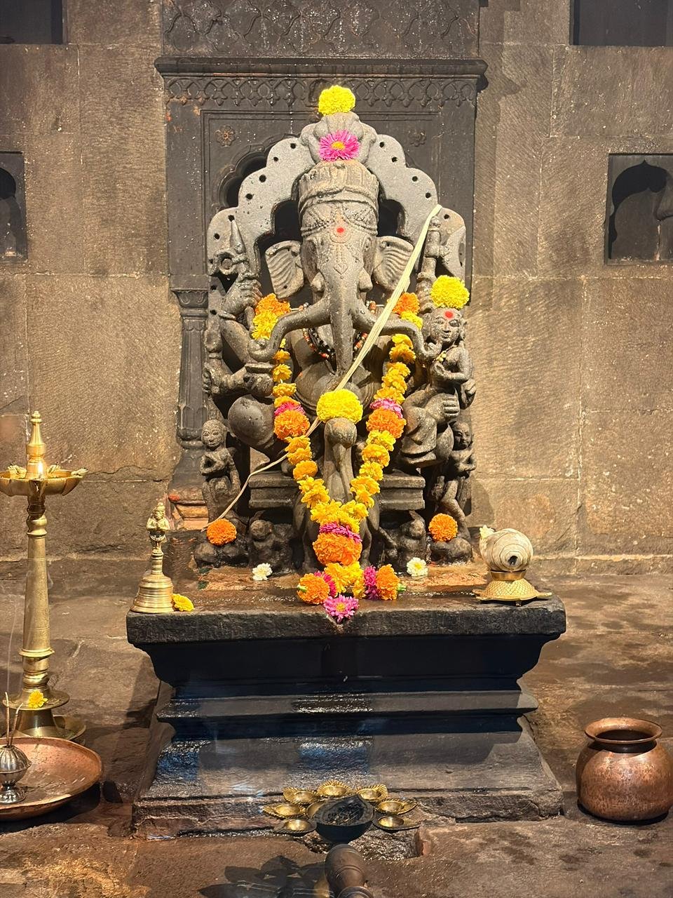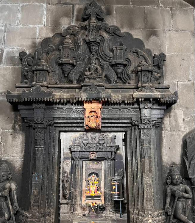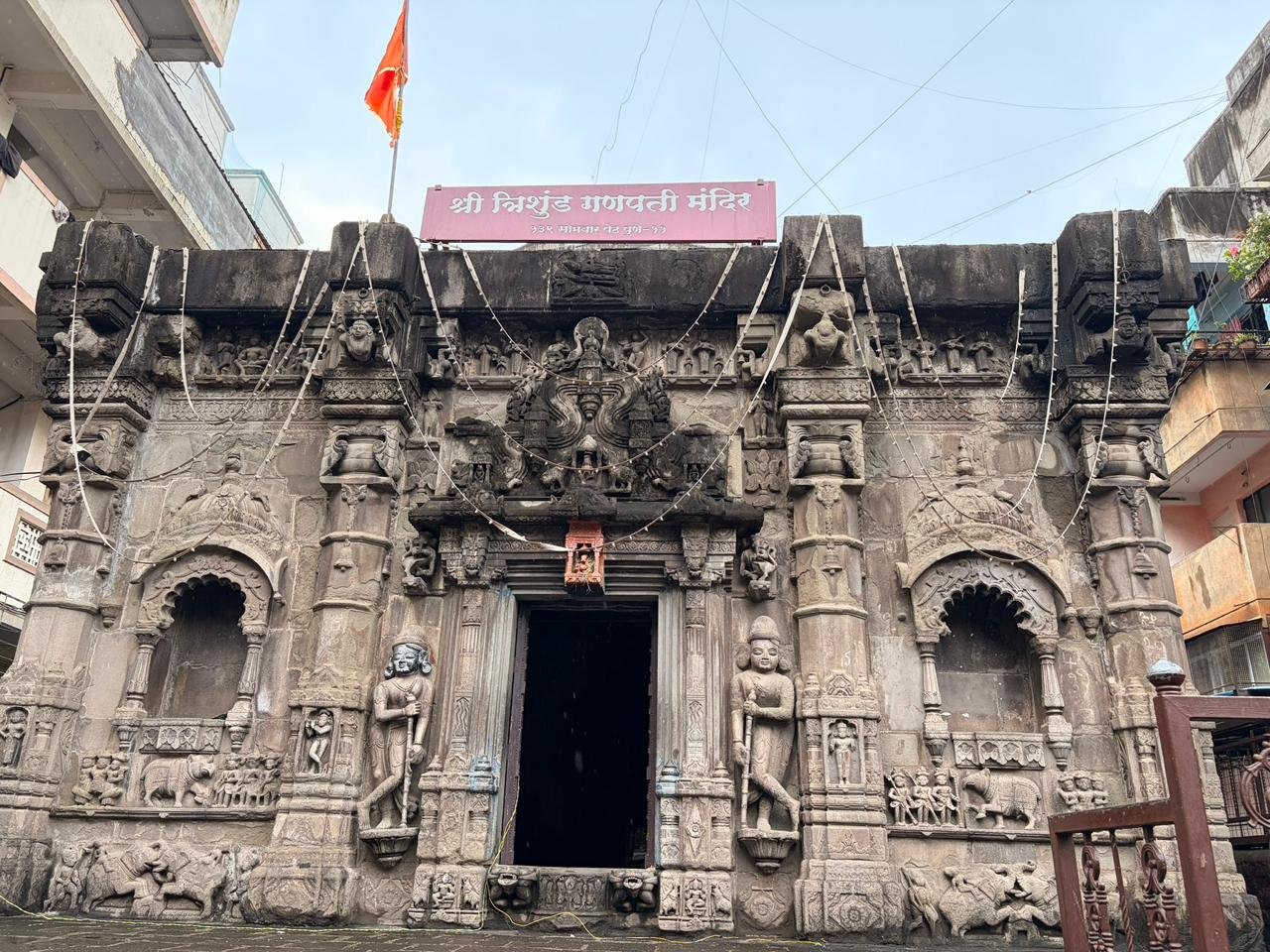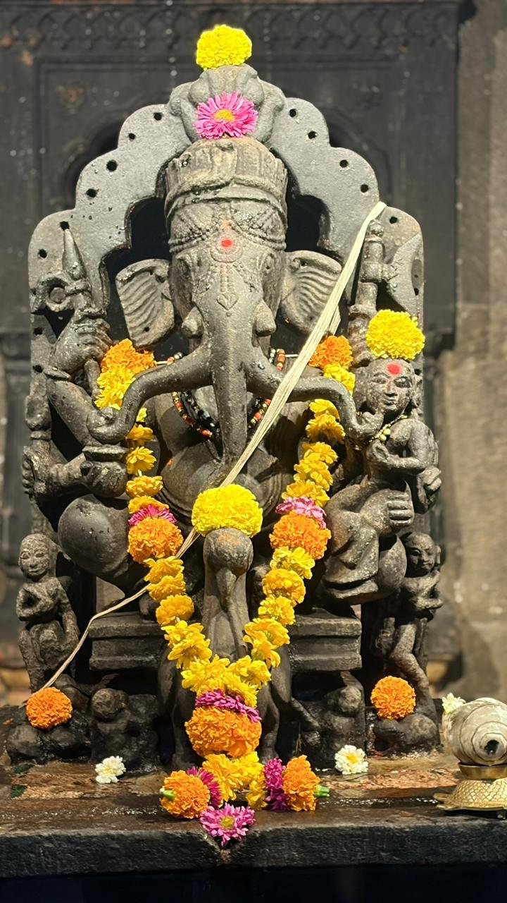 - Temple History The Trishunda Ganapati Temple, also known as the Trishund Ganpati Mandir, is one of Pune’s most fascinating and historic temples. It is located in the heart of the old city, in the Somwar Peth locality, just about two kilometers from Pune Junction railway station. This temple as a silent reminder of the Peshwa era’s architectural and cultural grandeur. Visitors can easily reach the temple by rickshaw, local bus, or even by foot from nearby city landmarks. However, parking for four-wheelers can be challenging due to the narrow by-lanes, so visitors often prefer to walk a short distance from the main road. The Trishunda Ganapati Temple dates back to the mid-18th century, constructed around 1754–1770 CE, during the late Peshwa period. It was built by Bhimjigiri Gosavi, a saint from Dhampur near Indore, who had settled in Pune. What makes this temple distinct is not just its age but its unique deity — a form of Lord Ganesha that is unlike any other in India. The idol depicts Lord Ganesha with three trunks (tri-shund), six arms, and seated upon a peacock (mayur vahana) rather than the traditional mouse. This representation is said to symbolize the mastery of Ganesha over time — the past, present, and future — as well as over the three gunas (qualities) of nature: sattva, rajas, and tamas. The temple also houses a samadhi (tomb) of its founder, Bhimjigiri Gosavi, located in an underground chamber beneath the main sanctum. This chamber remains closed to the public for most of the year and is only opened on Guru Purnima, a special day that draws thousands of devotees. Over the centuries, the Trishunda Ganapati Temple has become both a spiritual center and a heritage monument that connects Pune’s religious life with its artistic and architectural traditions. Architectural Significance The temple is constructed entirely out of black basalt stone and is a remarkable example of the late-Peshwa architectural style. Its design reflects a blend of Rajasthani, South Indian, and Malwa influences, combined with local Maratha craftsmanship. The external façade is decorated with elaborate carvings — intricate figurines, mythological scenes, and ornamental motifs that show exceptional artistry. The temple also bears three inscriptions — two in Sanskrit (Devanagari script) and one in Persian. The Persian inscription interestingly dedicates the temple to Lord Dattatreya, which reflects the inclusive spiritual beliefs of that era. Inside, the main sanctum houses the Trishunda Ganapati idol — a stunning basalt sculpture radiating power and serenity. The basement level, which holds the samadhi of the temple’s founder, adds to the temple’s mystical atmosphere, and visiting it during Guru Purnima is considered a sacred privilege.. త్రిశుండ గణపతి ఆలయం, త్రిశుండ గణపతి మందిర్ అని కూడా పిలుస్తారు, ఇది పూణేలోని అత్యంత ఆకర్షణీయమైన మరియు చారిత్రాత్మక ఆలయాలలో ఒకటి. ఇది పాత నగరం నడిబొడ్డున, సోమ్వార్ పేట్ ప్రాంతంలో, పూణే జంక్షన్ రైల్వే స్టేషన్ నుండి కేవలం రెండు కిలోమీటర్ల దూరంలో ఉంది. పేష్వా శకం యొక్క నిర్మాణ మరియు సాంస్కృతిక వైభవాన్ని నిశ్శబ్దంగా గుర్తుచేసే ఈ ఆలయం. సందర్శకులు రిక్షా, స్థానిక బస్సు లేదా సమీపంలోని నగర ప్రదేశాల నుండి కాలినడకన కూడా ఆలయానికి సులభంగా చేరుకోవచ్చు. అయితే, ఇరుకైన బై-లేన్ల కారణంగా నాలుగు చక్రాల వాహనాల పార్కింగ్ సవాలుగా ఉంటుంది, కాబట్టి సందర్శకులు తరచుగా ప్రధాన రహదారి నుండి కొద్ది దూరం నడవడానికి ఇష్టపడతారు. త్రిశుండ గణపతి ఆలయం 18వ శతాబ్దం మధ్యకాలం నాటిది, ఇది పేష్వా కాలంలో 1754–1770 CEలో నిర్మించబడింది. దీనిని పూణేలో స్థిరపడిన ఇండోర్ సమీపంలోని ధంపూర్కు చెందిన భీంజిగిరి గోసావి నిర్మించారు. ఈ ఆలయాన్ని ప్రత్యేకంగా తీర్చిదిద్దేది దాని వయస్సు మాత్రమే కాదు, దాని ప్రత్యేకమైన దేవత - భారతదేశంలోని మరే ఇతర గణేశుడి రూపం కాదు. ఈ విగ్రహం గణేశుడిని మూడు తొండాలతో (త్రి-షండ్), ఆరు చేతులతో, సాంప్రదాయ ఎలుక కంటే నెమలి (మయూర్ వాహన)పై కూర్చున్నట్లు చిత్రీకరిస్తుంది. ఈ ప్రాతినిధ్యం కాలక్రమేణా - గతం, వర్తమానం మరియు భవిష్యత్తు - అలాగే ప్రకృతి యొక్క మూడు గుణాలు (లక్షణాలు): సత్వ, రాజస మరియు తమస్సుపై గణేశుడి పాండిత్యాన్ని సూ